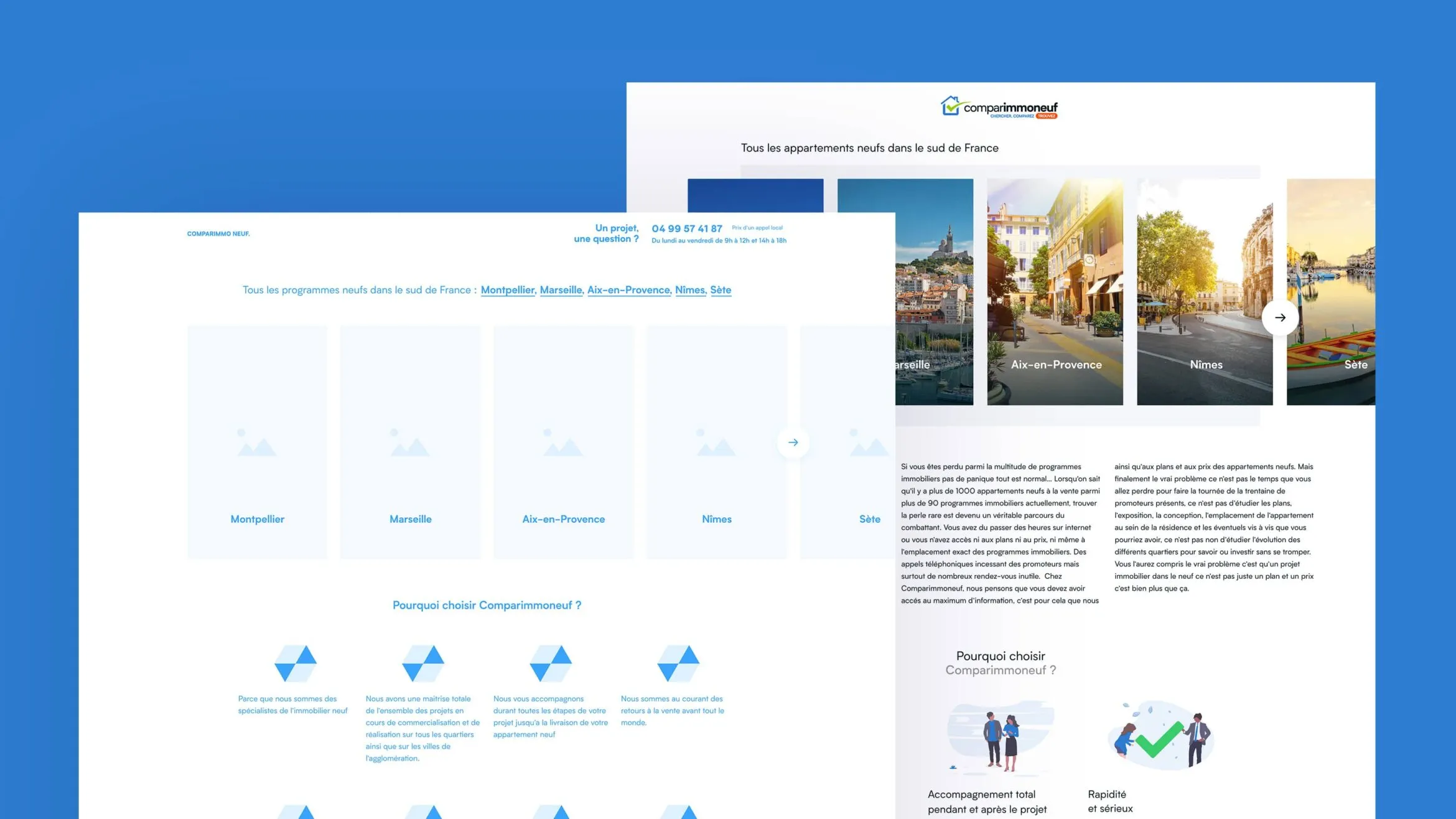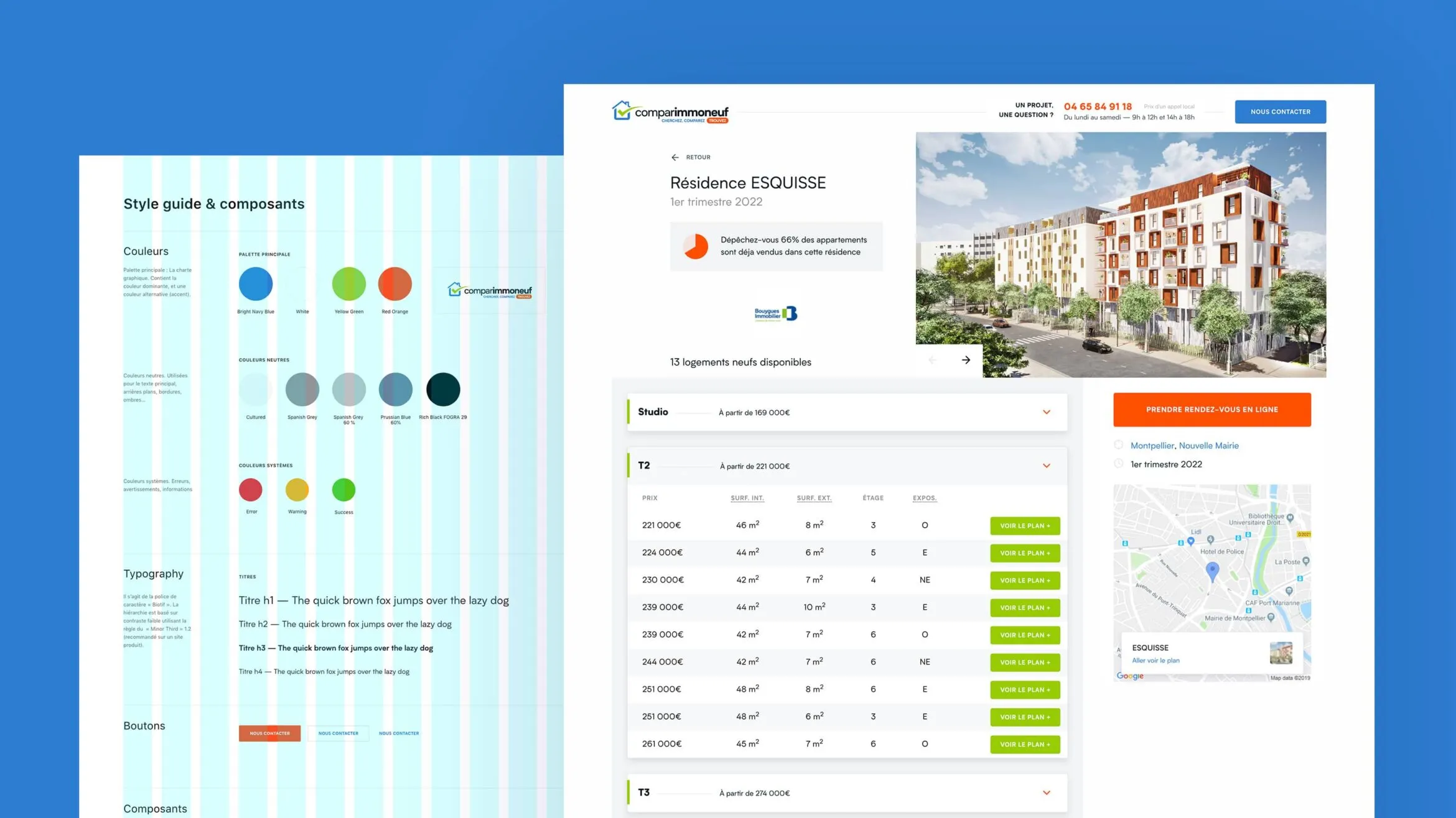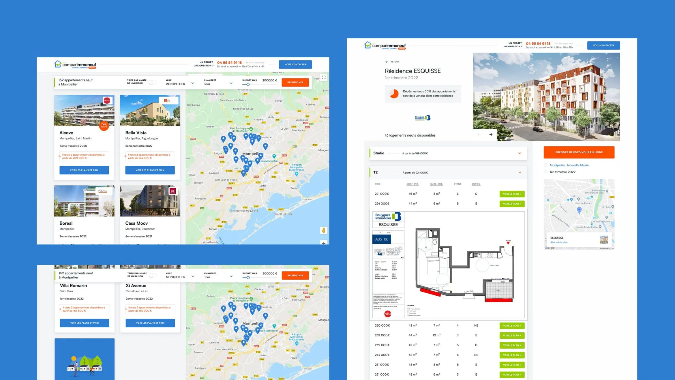 Pour répondre à l’objectif de Comparimmoneuf en terme de conversion, plusieurs solutions ont été développées. La création de fiches produits très travaillées et la mise en place de call to action efficaces ont permis à l’utilisateur une immersion directe dans le bien et donc une augmentation de la génération de lead.