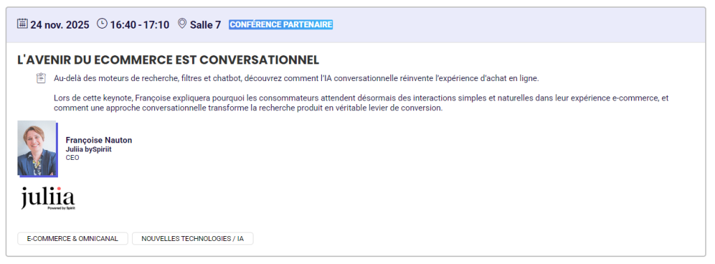 Elle expliquera pourquoi les consommateurs attendent désormais des interactions plus simples et plus naturelles, et comment une approche conversationnelle peut transformer la recherche produit en levier de conversion.